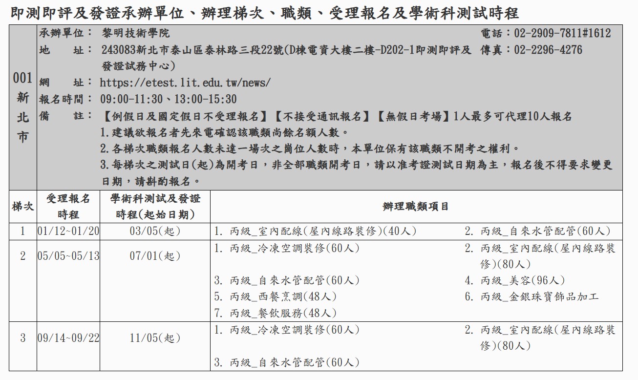115年度即測即評及發證技術士技能檢定報名相關資訊如下,請參閱:
