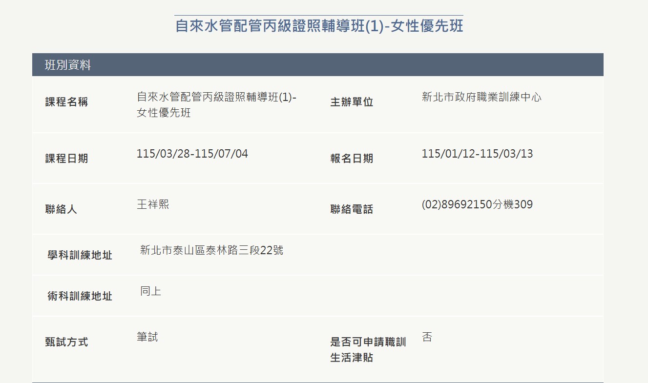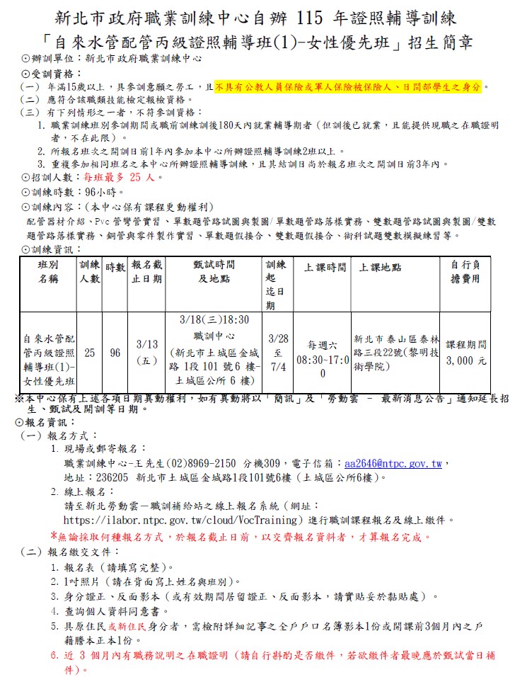 3.新北職訓聯絡人:新北職業訓練中心王祥熙先生,電話:02-89192150分機309
