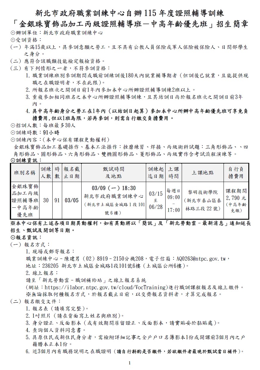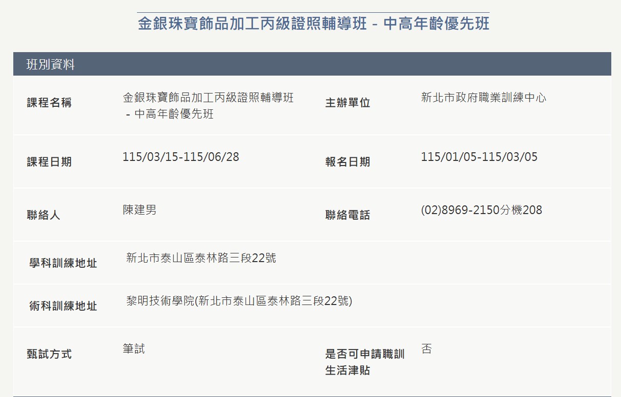 3.新北職訓聯絡人:新北職業訓練中心陳建男先生,電話:02-89192150分機208,電子信箱:AQ0263@ntpc.gov.tw