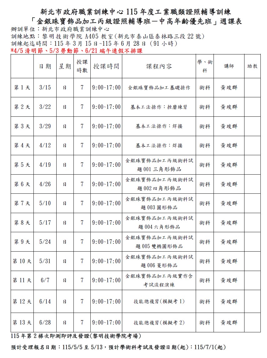 四、上課期間與地點:本校A棟第一教學大樓4樓A405金工教室(每周日早上9:00至下午17:00)